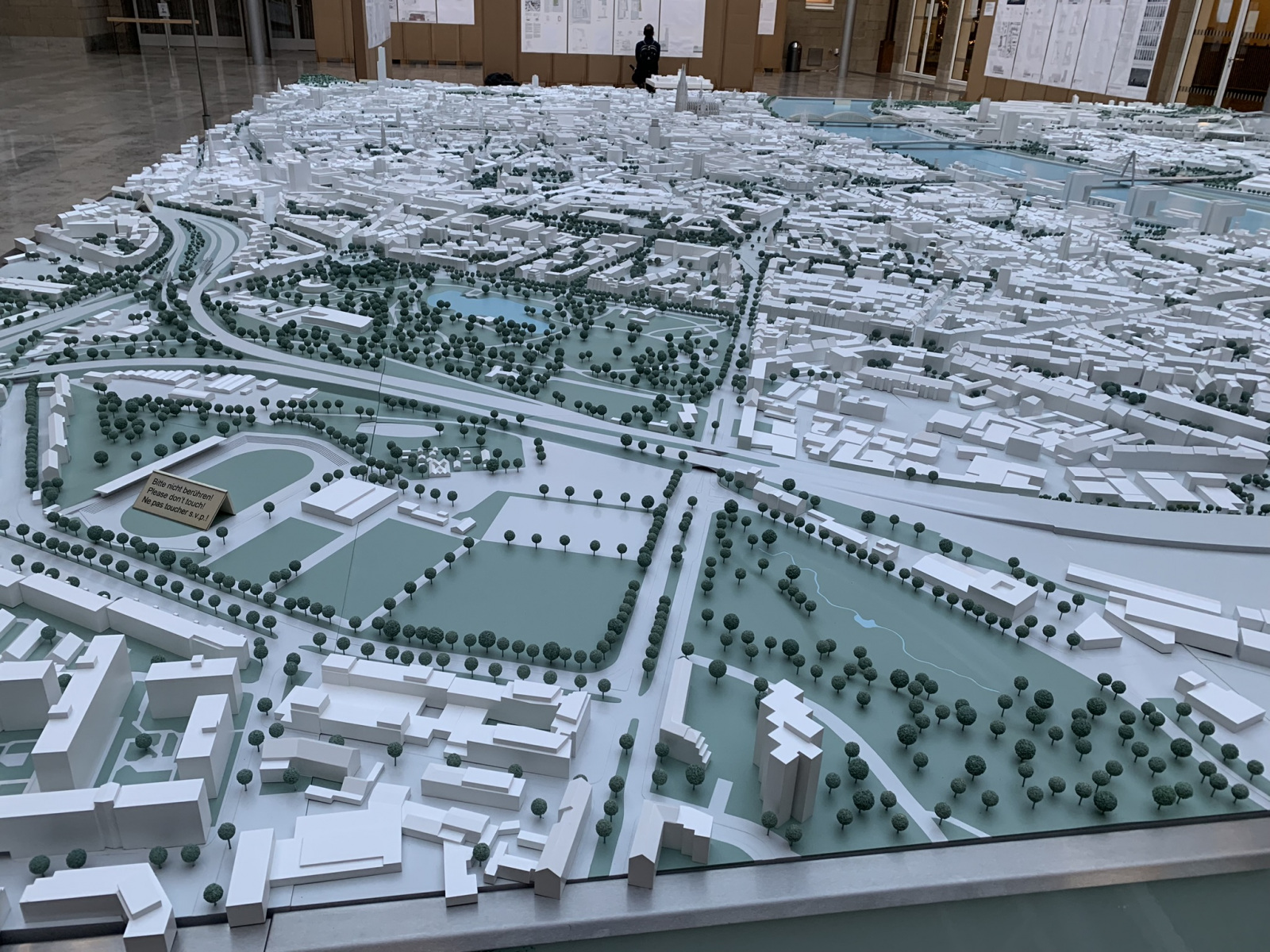 Doch erst im Jahr 1991 wurde die Idee für ein solches Stadtmodell von den beiden Architekten Dörte Gatermann und Kaspar Kraemer1Kraemer ist auch der Architekt von Kölns größtem Wasserstandsmelder: Dem Pumpwerk Schönhauser Straße. konkretisiert. 1993 entstanden die ersten jeweils 1 x 1 Meter großen Platten des Modells. Danach unternimmt das stetig wachsende Modell – es umfasst 1996 bereits 30 Platten – eine wahre Odyssee durch die Stadt. Aufstellungsorte waren die alte Druckereihalle des Stadthauses und die Halle des Technischen Rathauses in Deutz. Seit 2004 steht das Modell im Spanischen Bau des Rathauses.