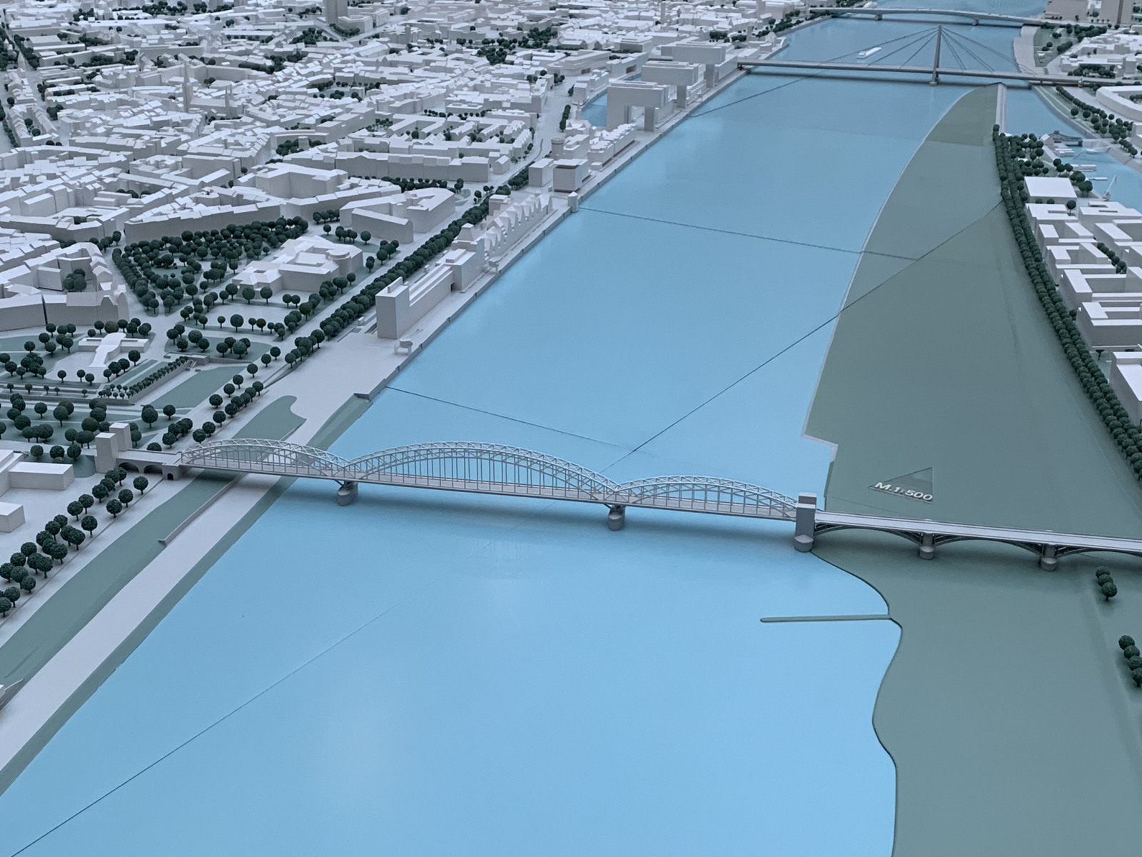 Möglich macht dies das Kölner Stadtmodell. Dabei handelt es sich um ein Modell der Innenstadt im Maßstab 1:500. So werden die 1,5 Kilometer von der Kölnarena zum Schokoladenmuseum zu gerade mal drei Metern, von der Hohenzollernbrücke zum Südstadion sind es nur sechs Meter. Und wie bei einem Rundflug über Köln kann man große Teile der Stadt auf einen Blick erfassen.