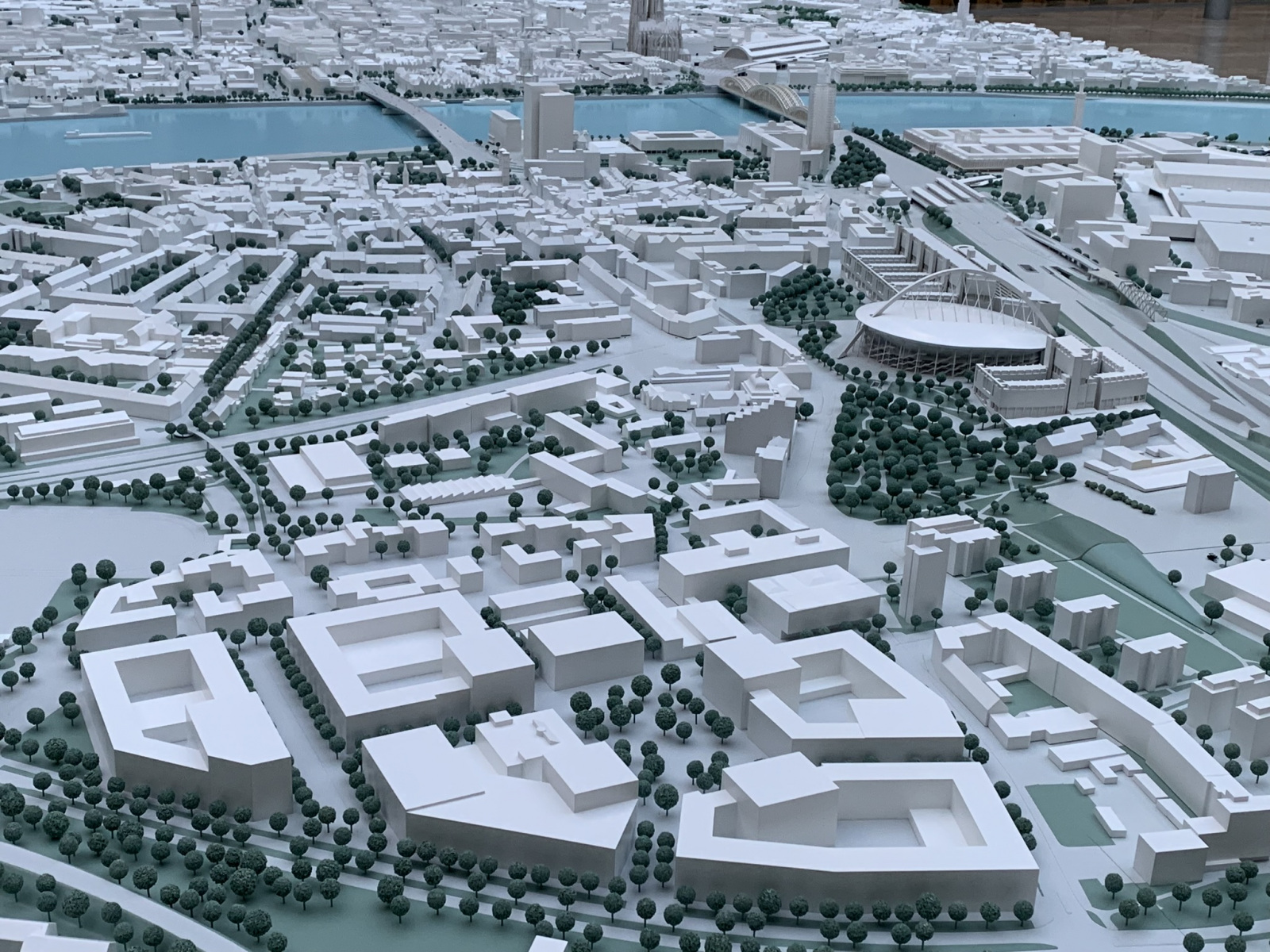 Möglich macht dies das Kölner Stadtmodell. Dabei handelt es sich um ein Modell der Innenstadt im Maßstab 1:500. So werden die 1,5 Kilometer von der Kölnarena zum Schokoladenmuseum zu gerade mal drei Metern, von der Hohenzollernbrücke zum Südstadion sind es nur sechs Meter. Und wie bei einem Rundflug über Köln kann man große Teile der Stadt auf einen Blick erfassen.