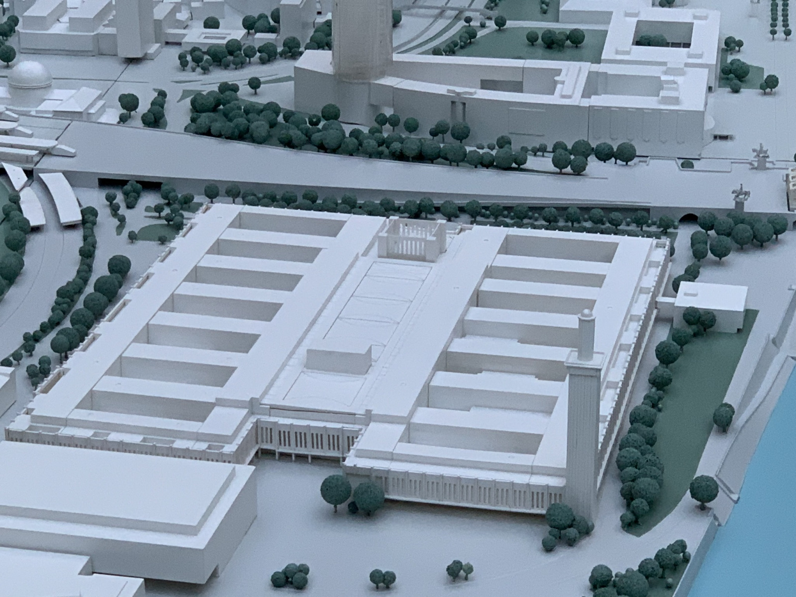 Die Gebäude im Modell werden aus speziellen Kunstharzen (Ureol oder Ecpocel) hergestellt. Die durchgängig weiße Lackierung hilft, den Überblick zu behalten. Um Neubauvorhaben umsetzen zu können, sind die Modelle aller Gebäude so auf den Platten verschraubt, dass diese sehr einfach ausgetauscht werden können.