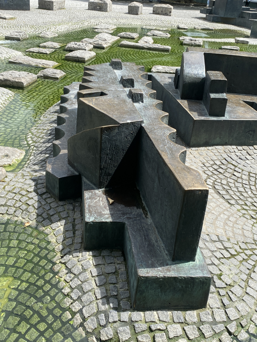 Die bronzenen Elemente des Paolozzibrunnens spiegeln die Stadtsilhouette wieder, Bild: Uli Kievernagel