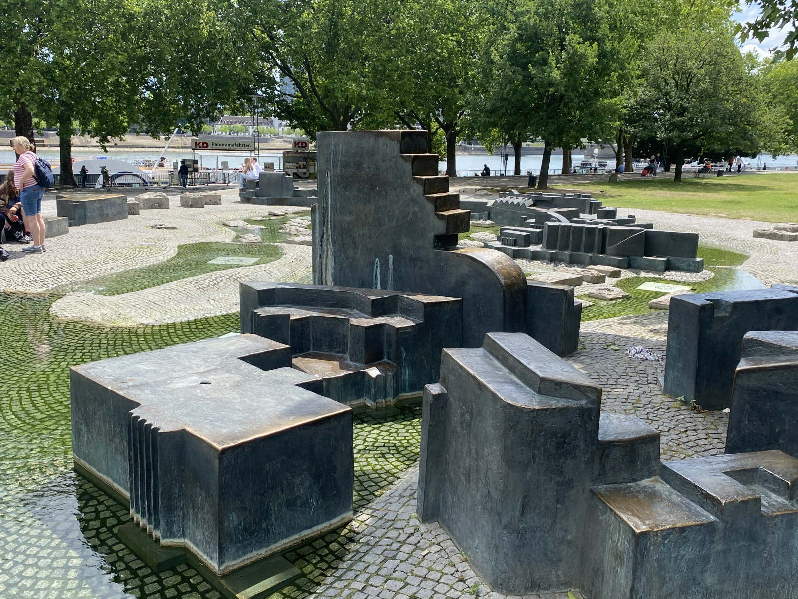 Die bronzenen Elemente spiegeln die Stadtsilhouette wider – so wie sie ist, so wie sie war, vielleicht auch so wie sie sein könnte. Das Wasser, das alles durchzieht, verbindet nicht nur die einzelnen Skulpturenteile miteinander, sondern auch die Vergangenheit mit der Gegenwart. Ein stiller Verweis auf den Rhein, der direkt daneben vorbeizieht – seit Ewigkeiten Lebensader der hier wohnenden Menschen.